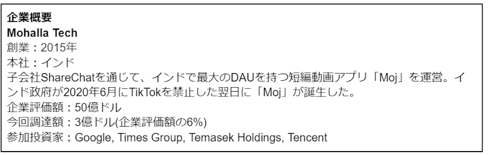 第一位は、短編動画アプリ「Moj」を運営するMohalla Tech(企業評価額 50億ドル)です。以前のWeekly記事で紹介した通り、競合の「Josh」を運営するVerSe Innovationも8億ドルの資金調達を行っており、企業評価額が50億ドルとなっています。同じ評価額の2社ですが、短編動画アプリ領域では「Moj」に分がありそうです。「Moj」はインドの短編動画アプリの中で、デイリーアクティブユーザー(DAU)数が最も多く、直近では6億ドルを投じて二番手のMX Takatakを買収しました。一方、「Josh」は業界の四番手です(※1)。米国企業との競争も無視できません。InstagramのReelsや YouTube shortなどは、自社アプリの中の一つのサービスとして短編動画を運営しています。今回の投資家では、競合サービスのYouTubeを運営するGoogleが参加しているのが興味深いです。また、インドで使用を禁止されているWeChatを運営するTencentも参加しており、両社とも今回の出資をインド市場でのプレセンス拡大につなげたいようです。