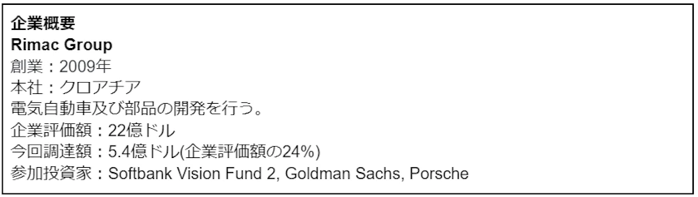 第二位は、電気自動車(EV)の製造を行うRimac Group(企業評価額 22億ドル)です。同社の強みは、電気自動車部品も製造できるため、高性能なEVを開発できることです。例えば、今年の夏に250万ドルで販売予定のRimac Neveraは、他のどの市販車よりも速い1.85秒で60mphまで加速できるそうです。同社の株主には、ポルシェ(株式の20%保有)や現代自動車などのOEMが入っており、同社の技術力の高さがうかがえます。同社は、Infobip(顧客とのコミュニケーションのためのクラウド製品)に次ぐクロアチアで2番目のユニコーンだそうです。