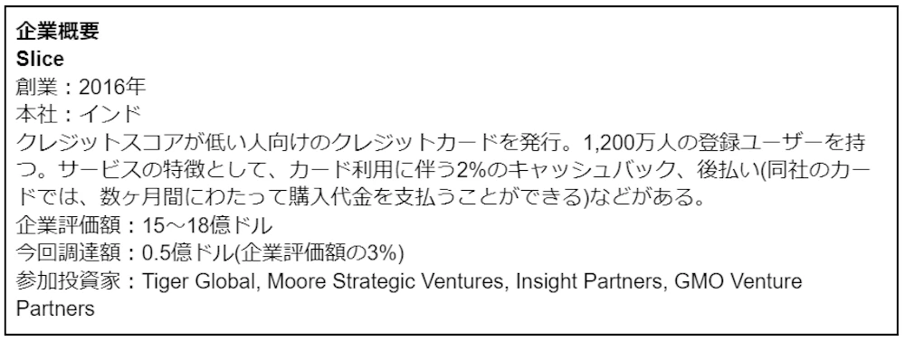 第三位は、クレジットカードのSlice(企業評価額 15~18億ドル)です。インドでは、14億人のごく一部のデータしか信用情報機関に登録されていないため、クレジットカードの普及率は3%(1人が複数のクレジットカードを持っていることを考えると、普及率はさらに低いと思われる)しかありません(※2)。同社は、これまでクレジットカードを発行できなかった若い社会人やクレジットスコアがない人などに向けて、過去の消費行動に基づいてカードの発行審査を行っています。同社は月に30万から40万枚のカードを発行しており、この数字は南アジア市場でトップのカード会社の1つとなっているようです(※3)。