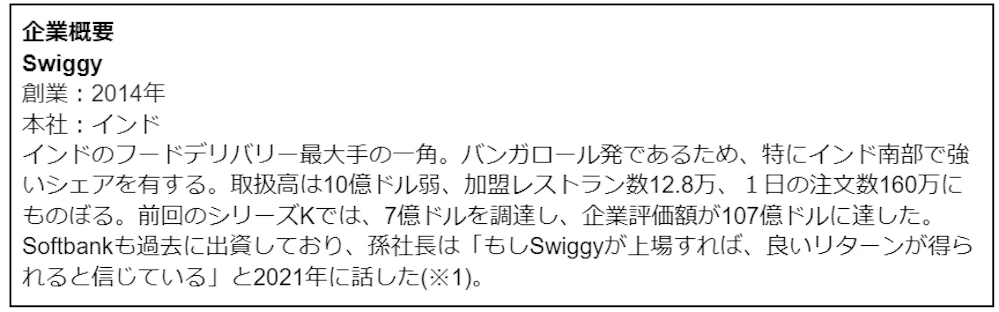 現在の相場環境は悪いため、Swiggyは、相場の復活を待ちながら、良いタイミングでの上場を試みていると考えられる。IPOでは、10億ドル程度調達するとみられており、今年の大型上場の一つになる可能性が高い。