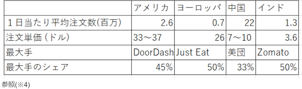 インドのフードデリバリーの市場規模は、日本より少し大きい。インドの市場規模は、50億ドル程度(※2)、日本は5000億円(約43億ドル) (※3) といわれている。フードデリバリー最大の市場であるアメリカと比べると、インドにおける1日当たり平均注文数は半分、注文単価は10%程度である。注文単価は、物価によって大きく左右されるため、物価が安いインドにとっては、中国同様、平均注文数を大きく伸ばすことが市場の拡大においては大事といえる。