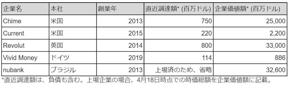 反面、アメリカでは、ネオバンクが多い。イギリスとは対照的に、アメリカ政府は、リーマンショックをきっかけに銀行業への新規参入の規制強化を行ったため、スタートアップは既存金融機関との提携を選ばざるをえなかった。アメリカで初めてチャレンジャーバンクが誕生したのは、Varo Bankが銀行免許を取得した2020年とつい最近である。