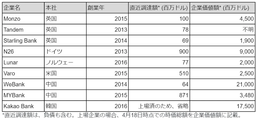 中国では、WeBank (Tencentが出資)とMYBank (Alibabaが出資)が中国の民間銀行部門における資産プール全体の50%近くを占めている2強である(※6)。チャレンジャーバンクの中で数少ない上場企業として、メッセンジャーアプリのKakaoが出資するKakao Bankがある。高値から株価は45%程度下落しており(4月19日時点)、他のチャレンジャーバンクは今後のIPOにあたって、Kakao Bankの株価動向に注意を払っていると考えられる。