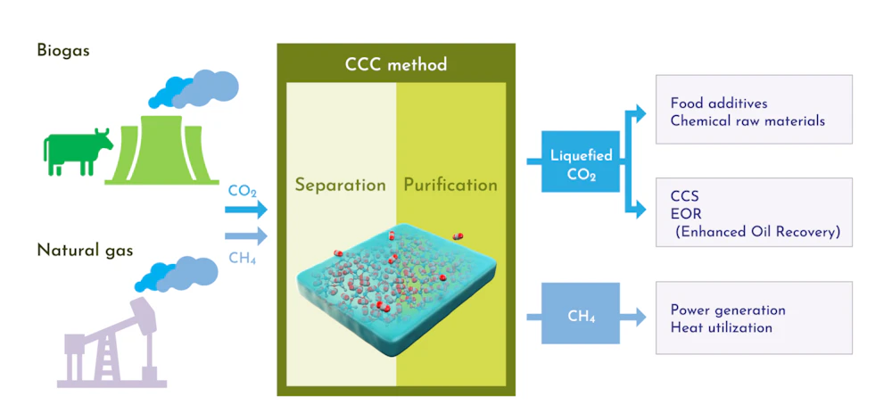 同社が開発する技術の核は、市販のPDMS(ポリジメチルシロキサン)ゴムを吸収材として用いた「低温吸収型CO2回収技術」である。これは、従来用いられてきたアルカリ水溶液による化学吸収と異なり、物理吸収をベースにしており、再生時に高温の加熱を必要としない点が特徴だ。CO2を吸収した後の再放出も低エネルギーで可能なため、プラント全体の運用コストを大幅に削減できる。