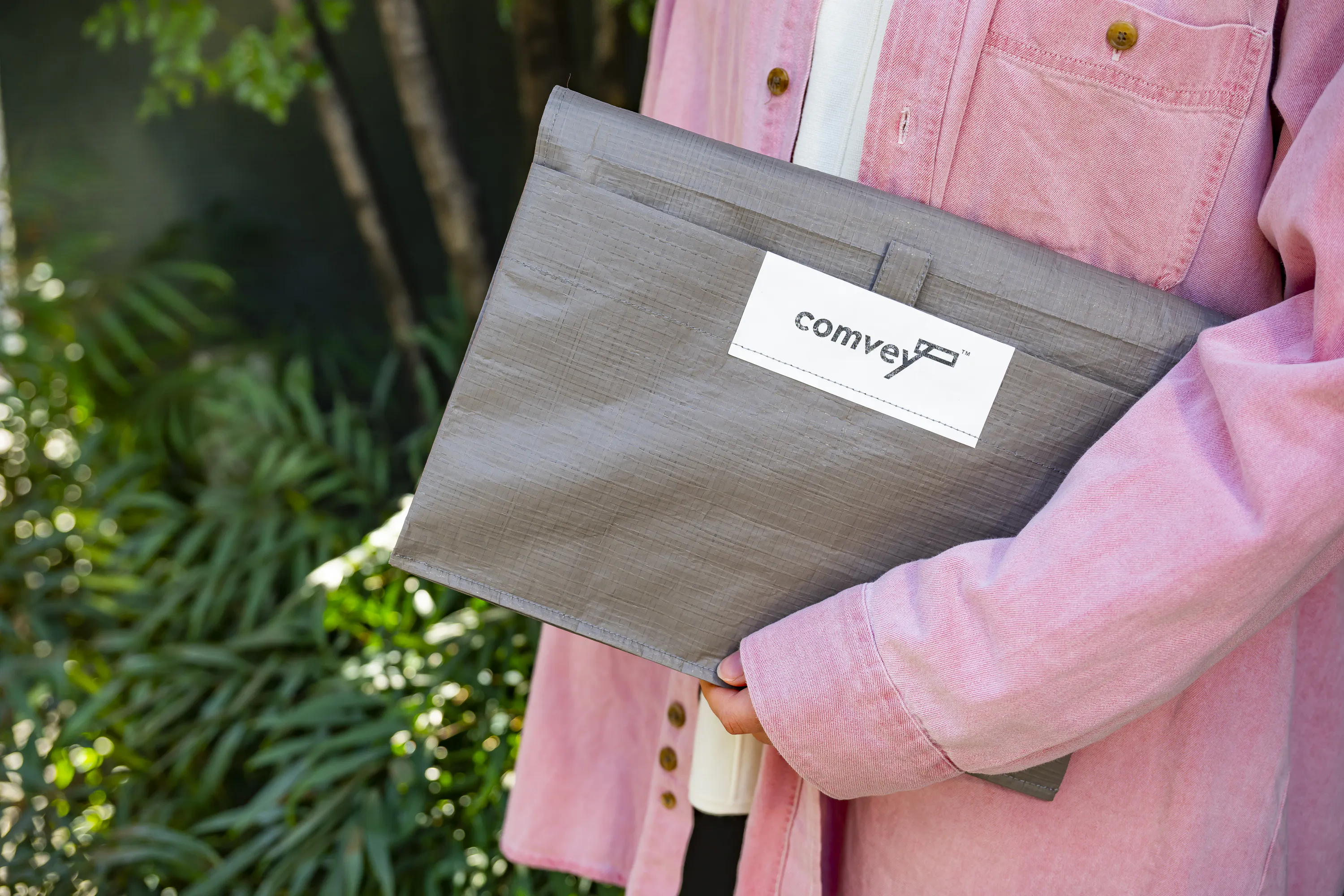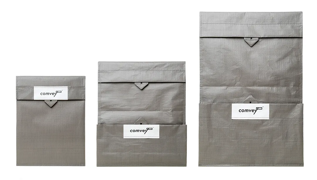 comveyが開発する「シェアバッグ®」は、配送時に繰り返し使える梱包バッグ。商品購入者は商品が届いた後にバッグを畳んでポスト投函することで、500円分のクーポンを得られる。段ボールの代わりにシェアバッグ®を使うことで梱包資材の削減につながる。