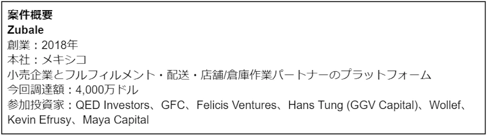 statistaによるとラテンアメリカのEコマースは2021年の850億ドル規模から2025年には1,600億ドルに届くと推定されています。シリーズA 2位のZubaleは小売事業者とフルフィルメント・配送・店舗/倉庫内作業等を担う独立パートナーを繋ぐサービスを展開し、Eコマースの展開を支援しています。メキシコ、コロンビア、ペルー、コスタリカで既に事業展開をしており、ブラジル、チリでも営業を開始しました。