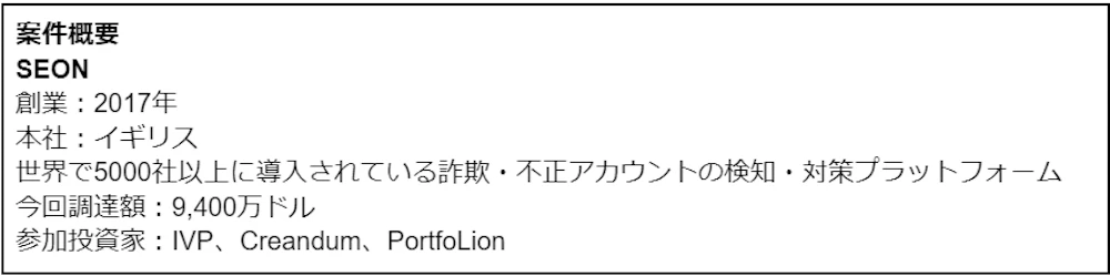シリーズB1社目は9,400万ドルを調達したSEONです。SEONはメール、電話、IPアドレスの分析モジュールであるIntelligence Tool、AIを活用した不正検知・自動削減をおこなうSense Platformを提供し、詐欺防止や不正アカウント対策のプラットフォームとなっています。