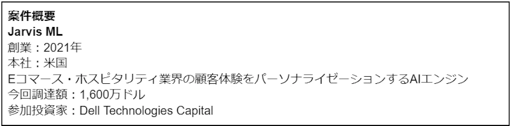 第2位は米国のJarvis MLです。パーソナライゼーションエンジンを提供しています。McKinseyの調査(※2)によると、40%の回答者はパーソナライズ体験を受けて当初想定より高価な商品を購入したことがあると答えており、8割近くの人が購入判断、購入リピート、親しい人への推奨をそれぞれ行いやすくなると回答しています。オンラインサービスの提供者にとって、パーソナライゼーションは売り上げを伸ばしていくための重要な要素であり、Grand View Researchによると推奨エンジン市場は2028年に173億ドル規模に達するとのことです。(※3)