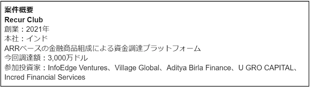シードラウンドで株式・負債の合計で3,000万ドルを調達したインドのRecur Clubは、創業1年以上・年間経常収益(ARR)5万ドル以上のSaaS企業など継続的な売上が期待できる企業を対象に、ARRをベースとした資金調達を可能にしています。企業の直近ARR・成長率を評価し、金融商品に変換して投資家に販売しており、欧米ではユニコーン企業であるPIPE(2021年5月に20億ドルの評価額で2億5,000万ドルを調達。当時の記事によると取扱企業は4,000社・取引可能なARRは10億ドル超)やCapchase(2021年6月に2億8,000万ドル調達)などが同様のサービスを展開しています。