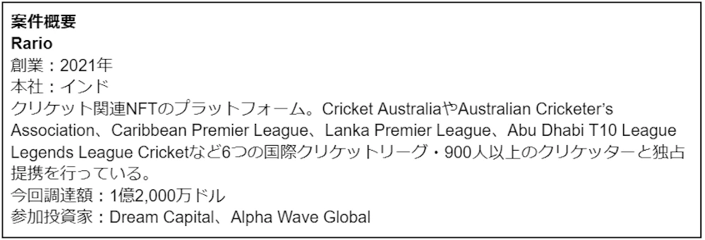 シリーズAの調達で調達額が大きかったのは、クリケットのNFTプラットフォームであるRarioです。RarioのNFTプラットフォームでは、クリケットの名シーンを抑えたデジタルカードや選手にフォーカスしたデジタルカードを取り扱っています。これまで米国、英国、オーストラリア、インドを含めた20か国のファンに対して50,000以上のNFTを販売してきたといいます。(※4)
