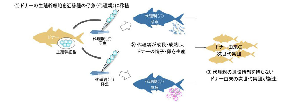 具体的な手法としては、ドナーとなる対象の魚から、生殖幹細胞という精子や卵のもととなる細胞を取り出します。そして、近縁の魚を代理親として、初期の発育段階である仔魚(しぎょ)の段階でドナーの生殖幹細胞を移植することで、代理親が成熟した際にドナー由来の魚を産ませることができます。