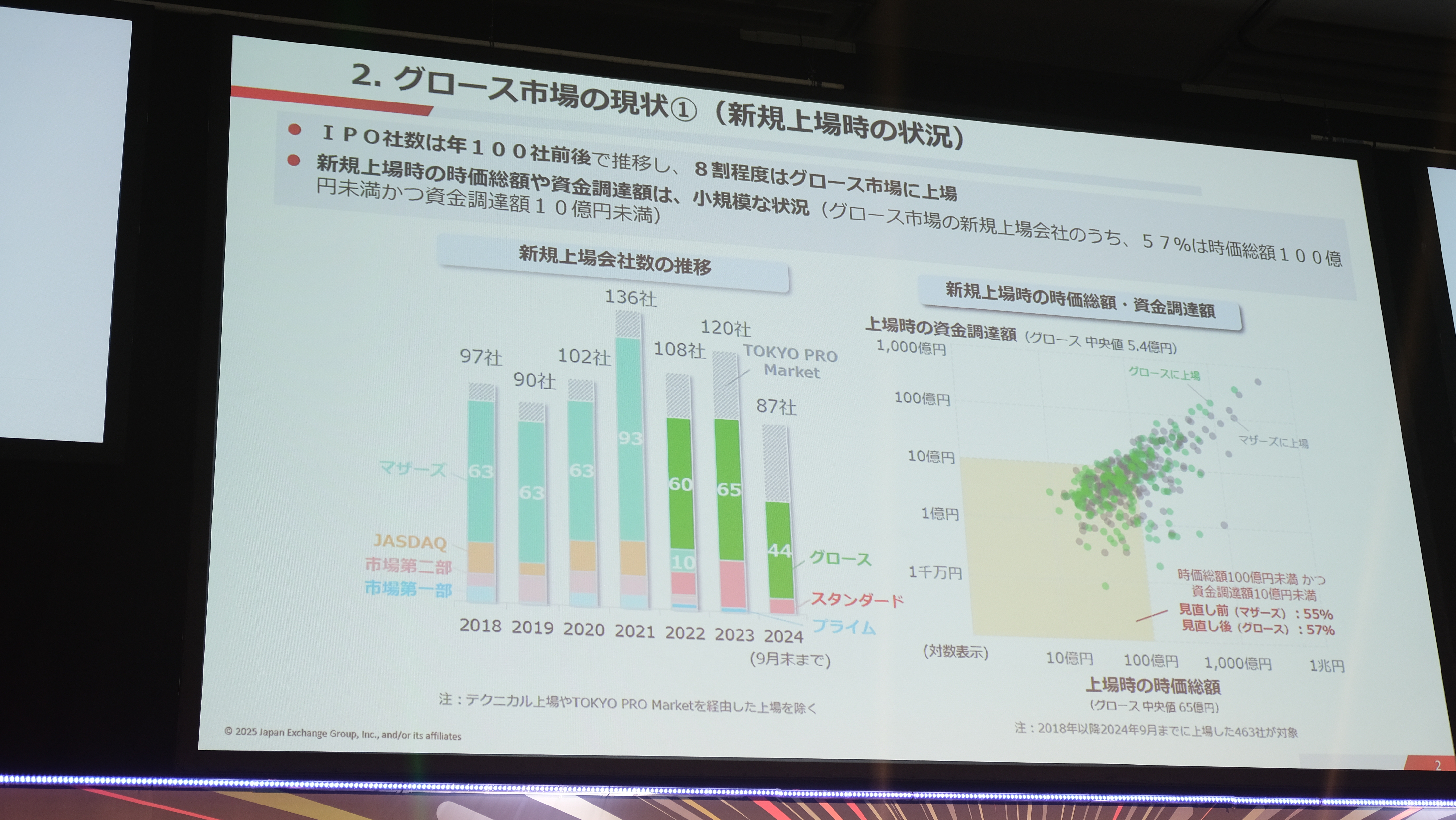 岩永氏:そのグロース市場の現状についてですが、左側は毎年のIPOの件数です。大体100件前後で推移しています。右側の縦軸がグロースに上場した際の資金調達額、横軸が上場したときの時価総額です。黄色く帯をかけた部分が、時価総額が100億未満かつ調達額が10億円未満の会社のエリアですけれども、現在も、そしてかつてのマザーズの時代も、大体5割から6割ぐらいの大半を占めていたという状況です。