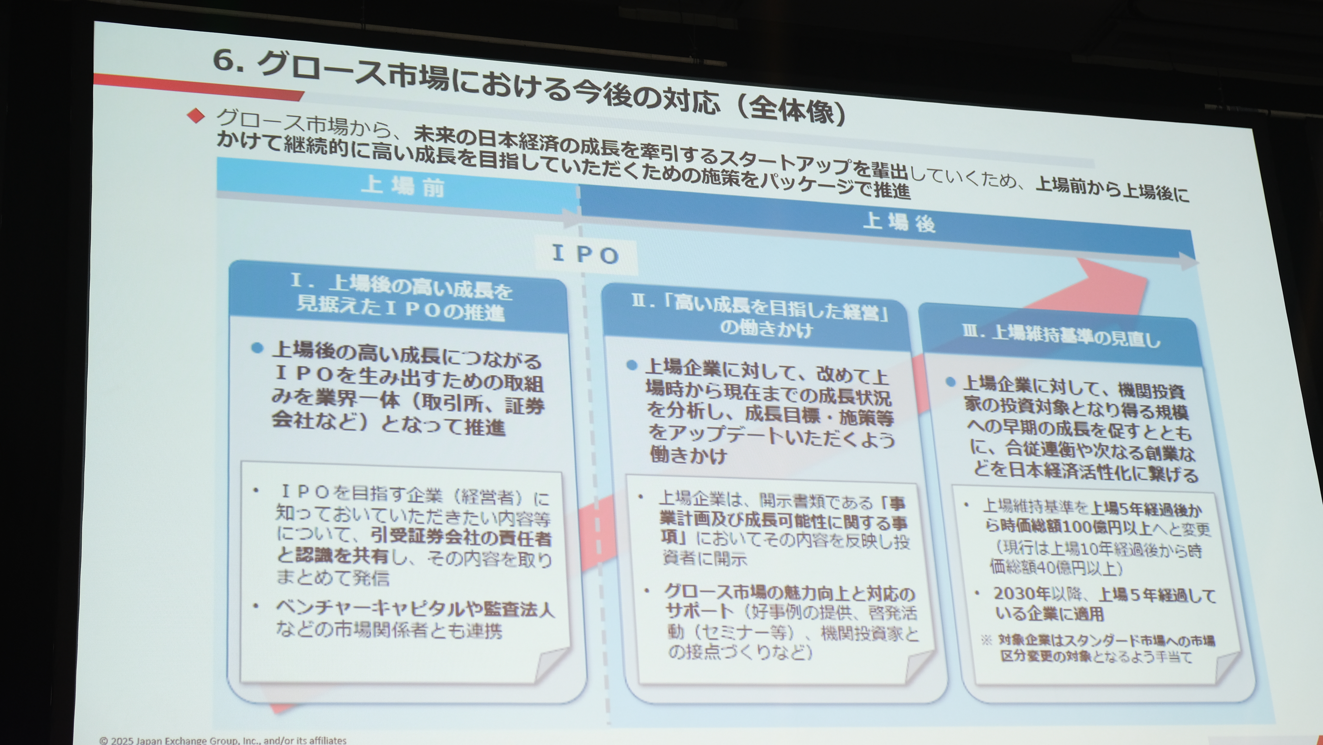 一番左側の一つ目ですが、こちらは上場した後にしっかりと成長するような環境整備をする目的で、私たち取引所だけではなくて、引受証券会社、監査法人やVCなど様々な方々とまず認識を共有することを行い、その上で、これからIPOをする経営者に対して、業界一体となって働きかけをしていこうというのがこの取り組みです。