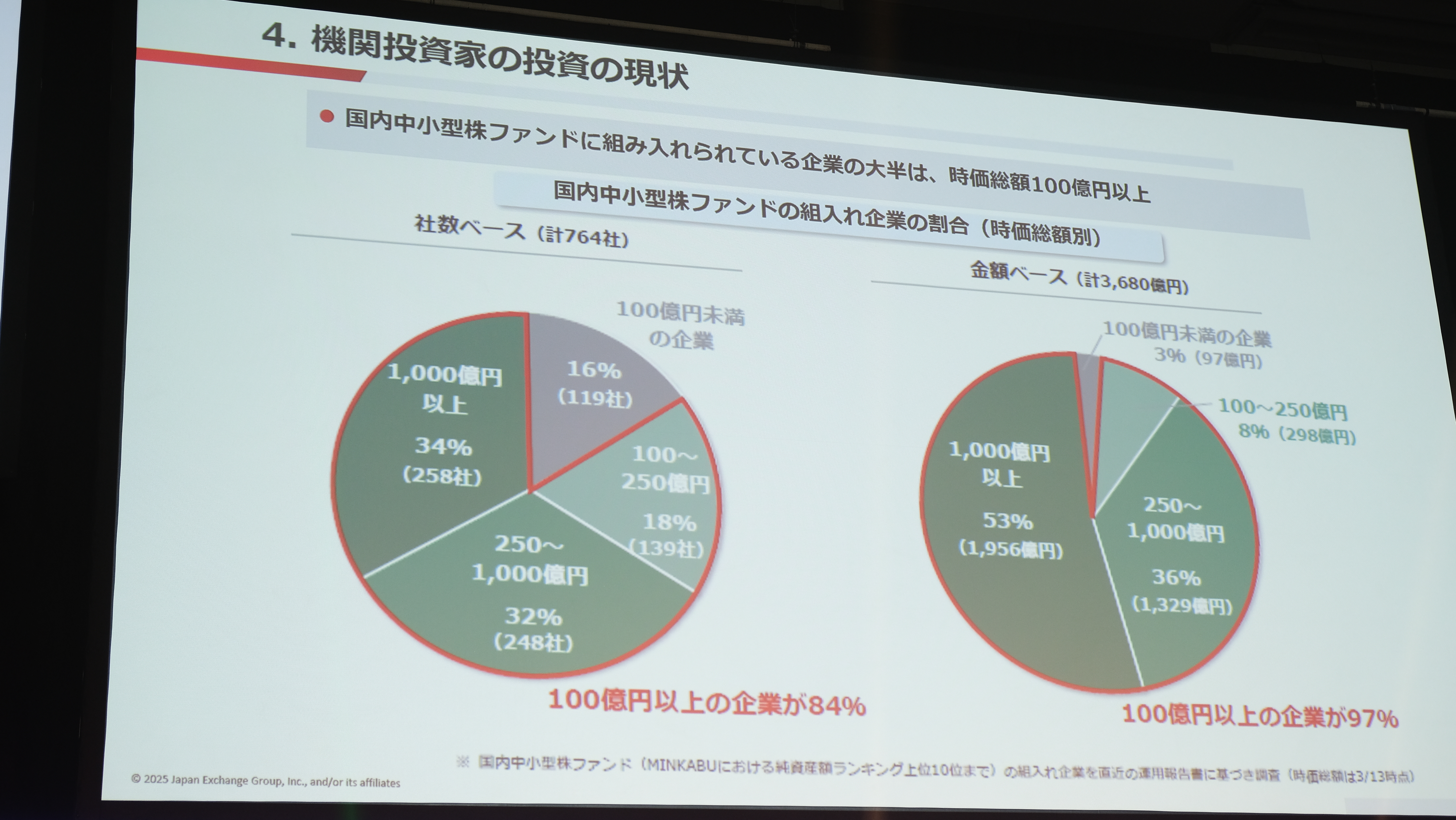 岩永氏:次のスライドは機関投資家の投資基準・大きさについて、どれくらいの金額以上が彼らの投資対象になるかということを示したものです。中小型株ファンドの投資対象について、社数ベースで見ると84%、ファンドの金額ベースで見ると97%が100億円以上じゃないと投資に値しないと、見ているんだということをこのグラフが示しています。