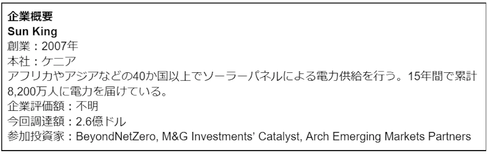 企業評価額は不明なものの、ソーラーパネルによる電力を提供するSun King(資金調達額:2.6億ドル)が大型の資金調達を行いました。Sun Kingがサービスを提供するサハラ以南のアフリカは、電気を利用できない人が世界人口の75%を占めています。電気を利用できない要因の一つに収入と比べた時の電力料金の高さがあり、電気を使えるようにするためには、いかに1回で支払う電力料金を下げられるかが重要です。そのため、Sun Kingは、電線網よりもコストを抑えられるソーラーパネルの設置や都度払いのシステムを活用しています。今までは、携帯電話やテレビなどの小型家電への電力供給にとどまっていましたが、今回の資金調達で冷蔵庫などの大型家電へ電力供給できる仕組みを整えるそうです。