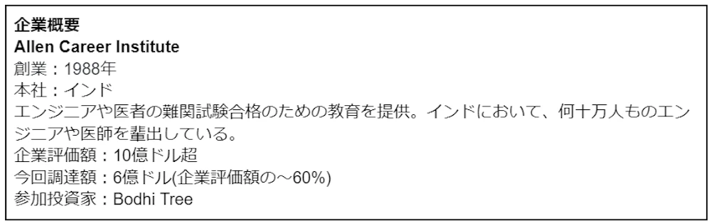 第一位は、エンジニアや医者の難関試験の合格サポートを行うALLEN Career Institute(企業評価額:10億ドル超)でした。同社は、以前の記事で取り上げたEdTech大手BYJU'sが昨年10億ドル近くで買収したAakashと競合しています。また、BYJU'sの競合であるUnacademyが同社の買収を検討していたことが噂されています(※1)。同社は、今回の資金調達をもって、幼稚園生から高校生までの試験対策を提供する予定であり、対象領域を広げたい意図がありそうです。