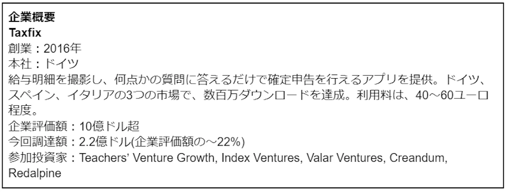第二位は、確定申告のモバイルアプリを提供するTaxfix(企業評価額:10億ドル超)でした。確定申告の簡易化ニーズは強いものの、年1回程度しか発生しない作業のため、顧客との接点が少ないことがTaxfixの課題です。そのため、今回の資金調達をもって、顧客との接点を増やすための製品を開発する予定です。Taxfixは海外展開も検討しているものの、確定申告は各国の法律などに基づくローカルビジネスの色合いが強いため、海外展開が本当に実現できるかはやや不透明です。米国では、1,160億ドルの時価総額のIntuitがTurbotaxという類似製品を提供しています。日本で個人事業主を中心に確定申告のクラウドサービスを提供している会社としては、弥生、フリー、マネーフォワードなどがあります。