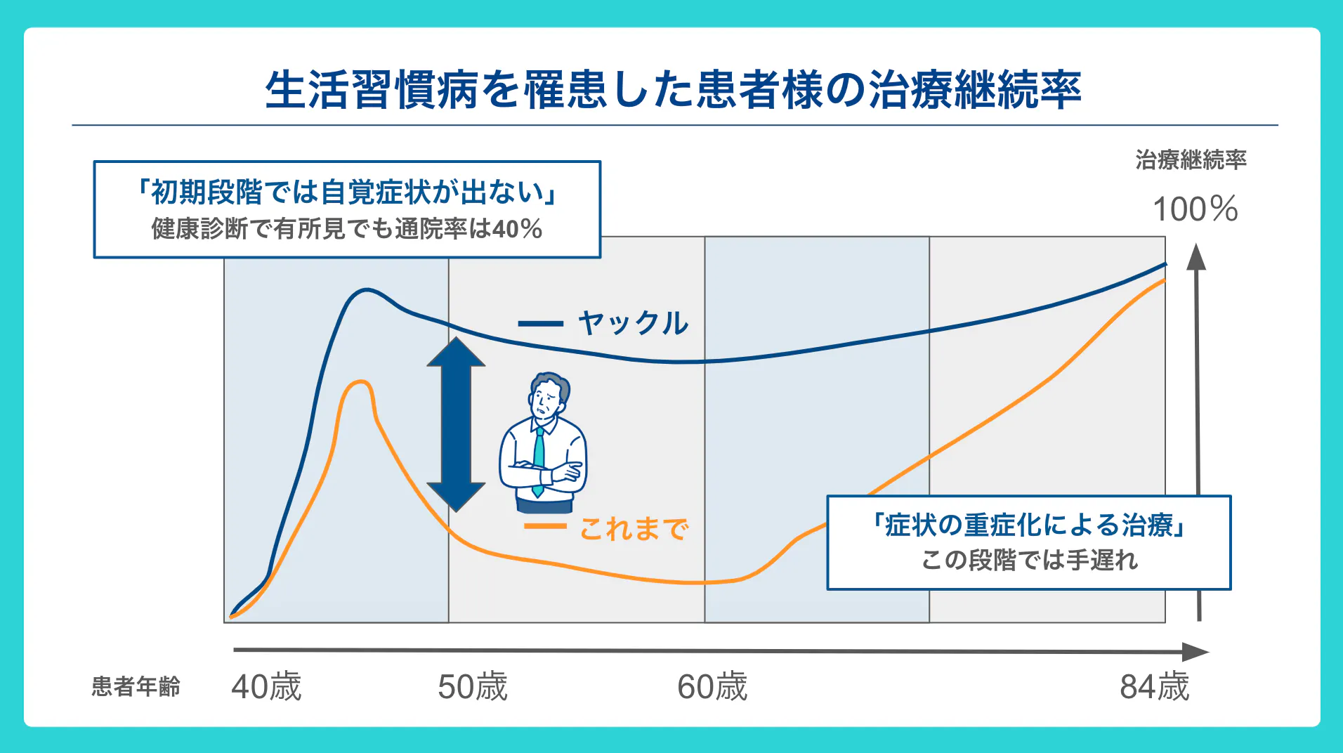 布川氏:40代や50代で健康診断に引っかかる人は多いですよね。一方で、人事や保健師から通院を勧められた人の中で、実際に通院する人は半分もいません。生活習慣病は命に関わる病気であるにもかかわらず、初期には自覚症状がありません。そのため通院を始めたとしても、ほとんどが半年や1年で治療を中断してしまうんです。60代や70代になって病状が表面化し、気づいた時にはすでに重症化していることも少なくありません。