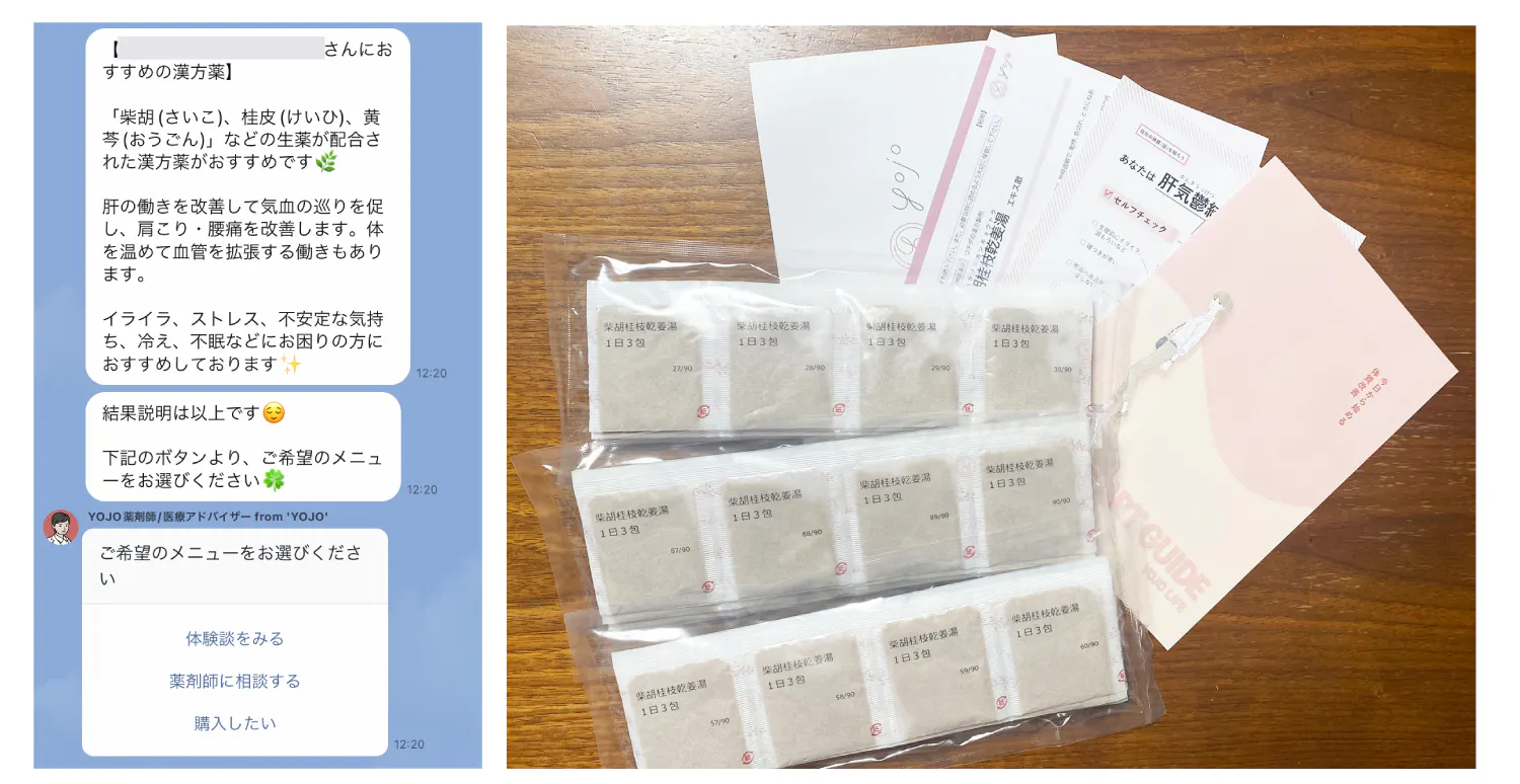 LINEでどんな質問にも丁寧に回答され、懸念事項を確認することができた。服用後も引き続きコミュニケーションが取れるのは、初めて漢方に挑戦する際にも安心感がある。