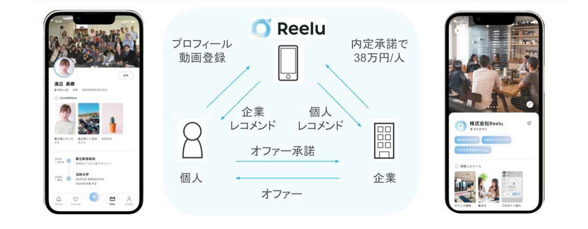 株式会社Reeluは、短尺動画を活用した新卒向け就職活動アプリ『Reelu(リール)』を開発する企業。 『Reelu』は、学生がプロフィール情報と簡単な質問への15秒以内の回答動画を登録して就職活動を行えるアプリ。企業は、これらの登録情報や動画を閲覧したうえで学生にスカウトを送ることができる。また、学生のスカウト承諾後に企業と学生がチャットできる機能を備える。