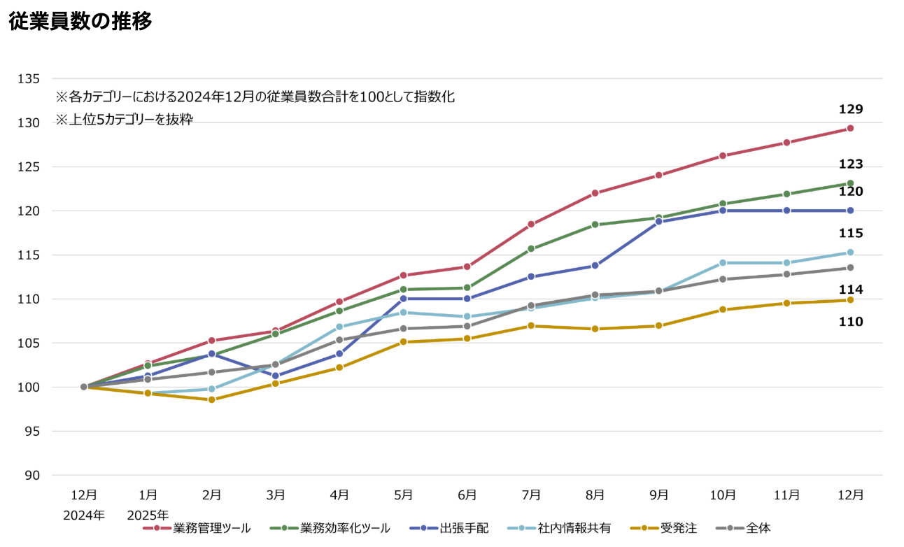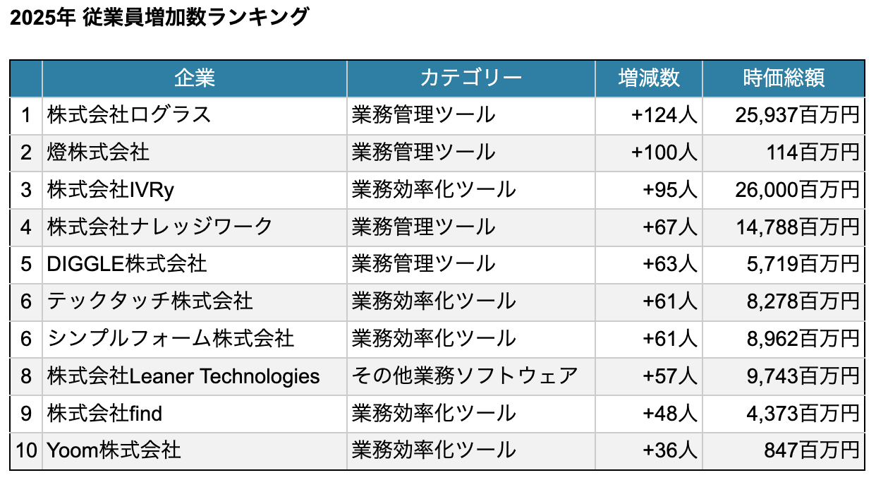 従業員数が増加している企業を見ると業務管理・効率化ツール関連の企業が多い。