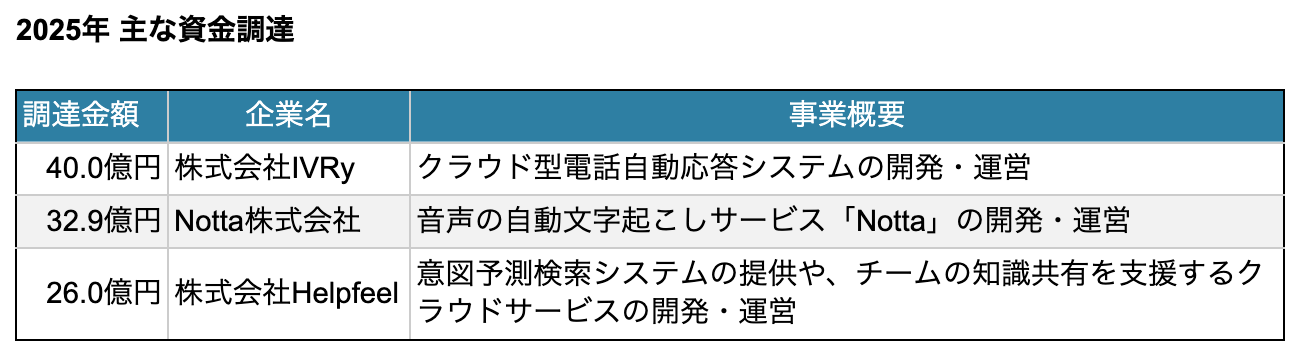 業務ソフトウェアセクターにおける主な調達として、AIによる電話代行サービスを提供する IVRy による40億円の調達や、AI議事録作成ツール『Notta』を提供する Notta による32.9億円の調達があった。両社はともに資金用途として、高機能、高信頼性、高度なセキュリティを追求したエンタープライズ向け事業拡大に伴う人材採用を挙げている。
